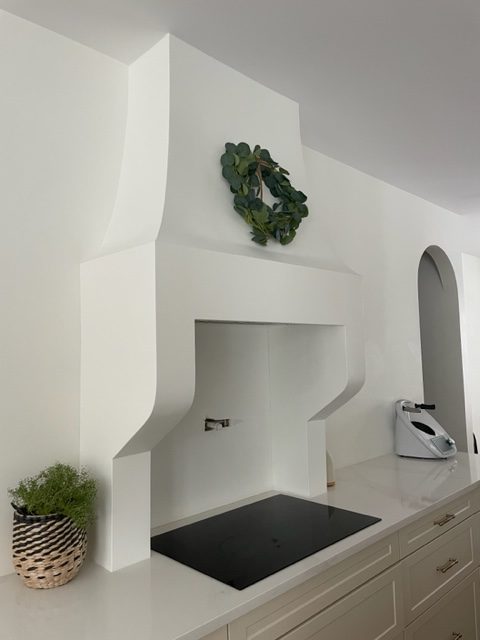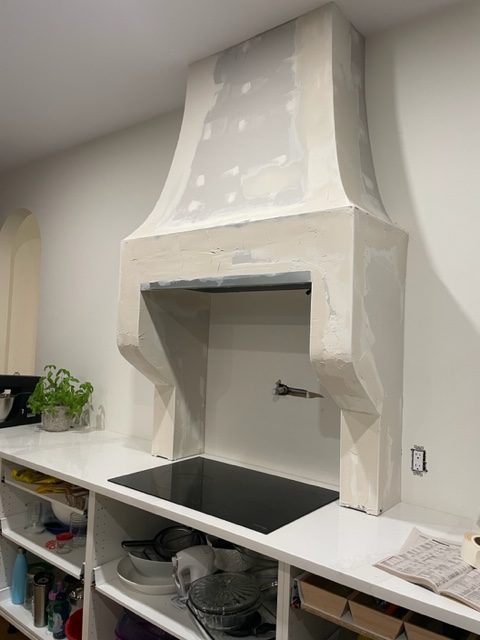 This step was the fun and messy part! Now it’s time to sand and smooth it out. It is very likely that you will have to come back with more mud and fix little spots here and there. Keep repeating this process until its smooth and pretty much perfect and ready to go for painting. Then it’s time to paint! We wanted it to match our wall colour so we went with simply white by Benjamin Moore. Last step which is also optional, but probably a good idea, is to clear coat the inside of the hood so it is easy to wipe down and keep clean.